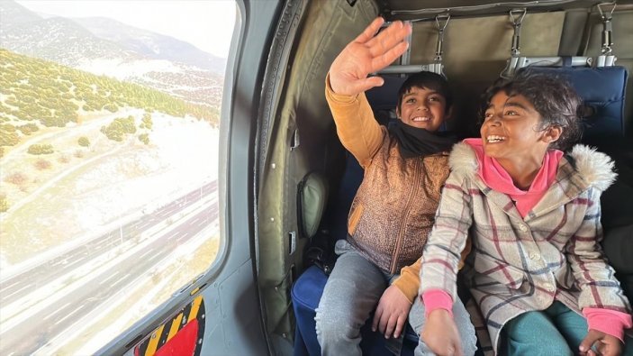 İlk kere helikoptere binmekten duydukları memnunluğu tabir eden, yaşları 7 ile 9 ortasında değişen 9 depremzede çocuk, yaklaşık yarım saat Gaziantep’e gökyüzünden bakma fırsatı buldu.